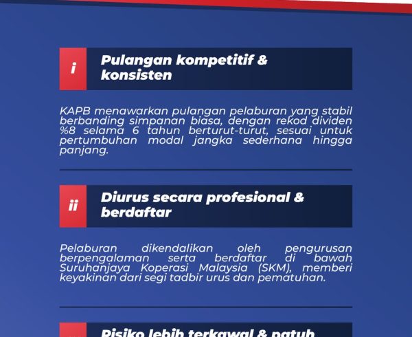 3 Sebab anda perlu melabur di KAPB. KAPB menawarkan pulangan pelaburan yang stabil berbanding simpanan biasa Pelaburan dikendalikan oleh pengurusan berpengalaman serta berdaftar di bawah Suruhanjaya Koperasi Malaysia (SKM). Dana dilaburkan dalam sektor yang lebihRead more