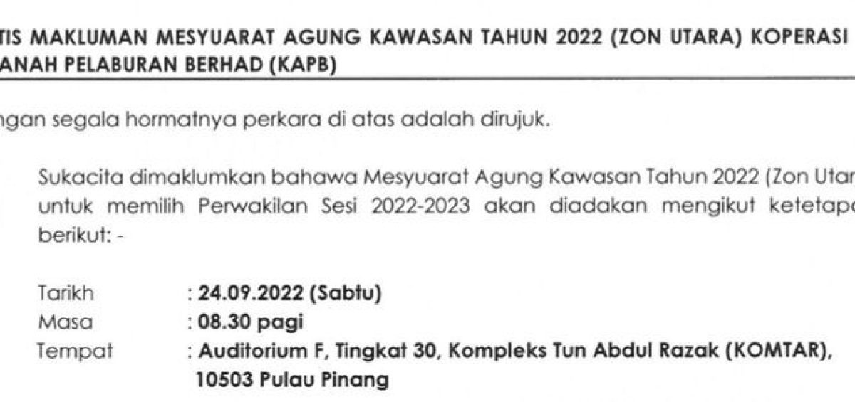 Makluman terkini: Tempoh untuk mengesahkan kehadiran Mesyuarat Agung Kawasan Selatan di pautan https://bit.ly/rsvp_agm_kawasan2 telah dilanjutkan sehingga 29/09/2022 (Khamis). Borang Pencalonan Perwakilan Sesi 2022-2023 boleh dimuat turun di https://www.kapb.com.my/wp-content/uploads/2022/08/Borang_Perwakilan_Borang_Biodata_2022.pdf. Borang pencalonan tersebut hendaklah di emel kepada kami di alamat [email protected] selewat-lewatnya pada 28/09/2022 (Ahad).Read more