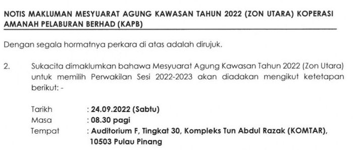 Makluman terkini: Tempoh untuk mengesahkan kehadiran Mesyuarat Agung Kawasan Tengah di pautan https://m5.gs/TnUyRW adalah pada atau sebelum 11/12/2022 (Ahad). Borang Pencalonan Perwakilan Sesi 2022-2023 boleh dimuat turun di https://www.kapb.com.my/wp-content/uploads/2022/08/Borang_Perwakilan_Borang_Biodata_2022.pdf. Borang pencalonan tersebut hendaklah di emel kepada kami di alamat [email protected] selewat-lewatnya pada 11/12/2022 (Ahad).Read more >